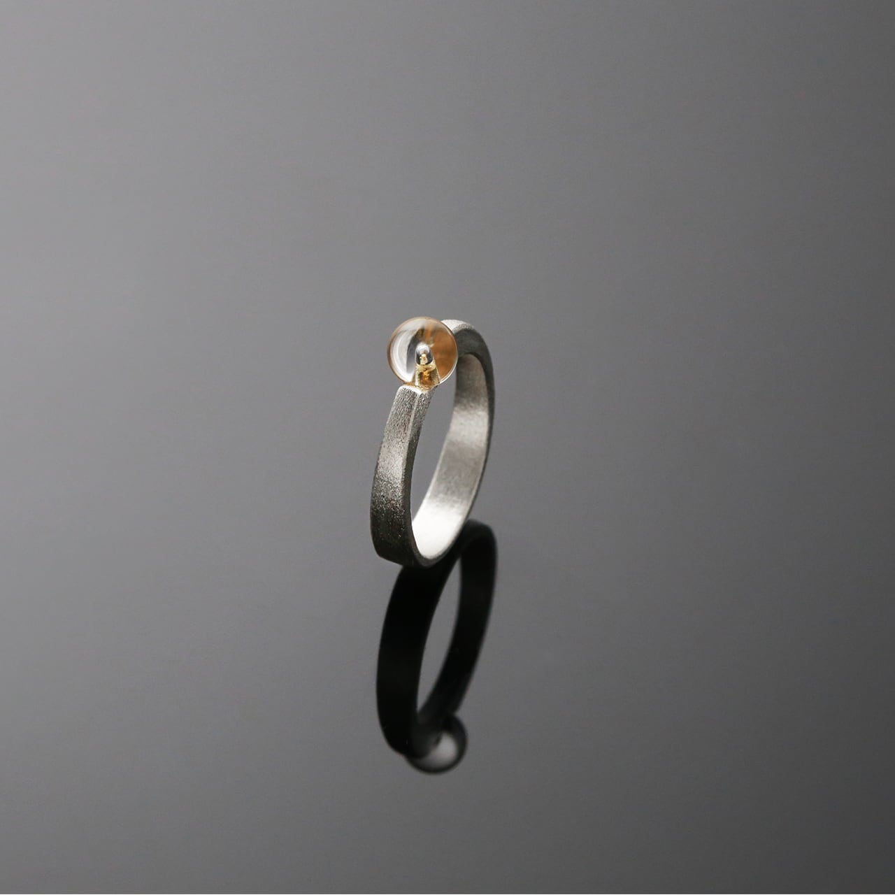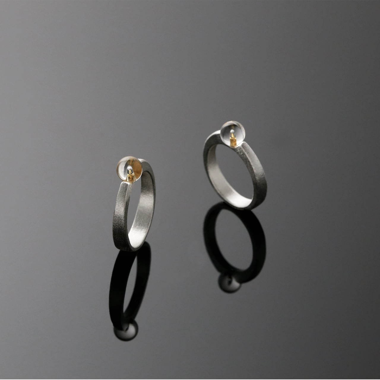 このレインドロップリングのスペシャルエディションでは、ロッククリスタルビーズをペグで留める小さな台座部分に、24Kゴールド箔を巧みに金箔で貼り付けています。角度によってロッククリスタルを覗き込むと、金箔が太陽の光のようにきらめきます。