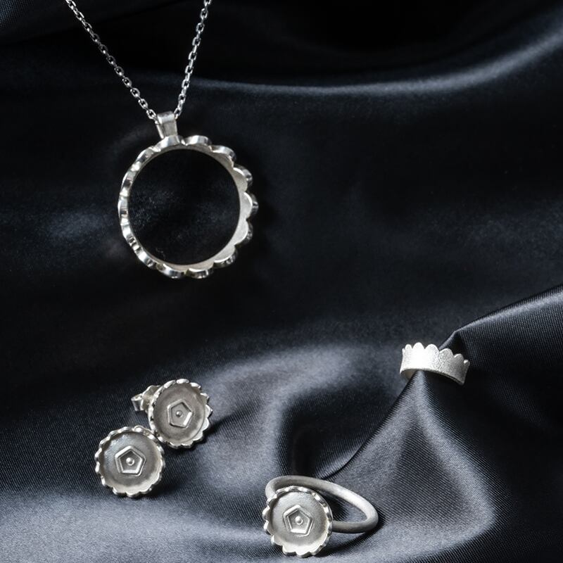 フィンランドのビルベリー(野生の森のブルーベリー)の底には、はっきりとした星型模様がよくあります。そこで私たちはこの模様からインスピレーションを得て、この限定ジュエリーコレクション「ブルーベリークラウン」のための、現代的で時代に左右されないデザインを生み出しました。
